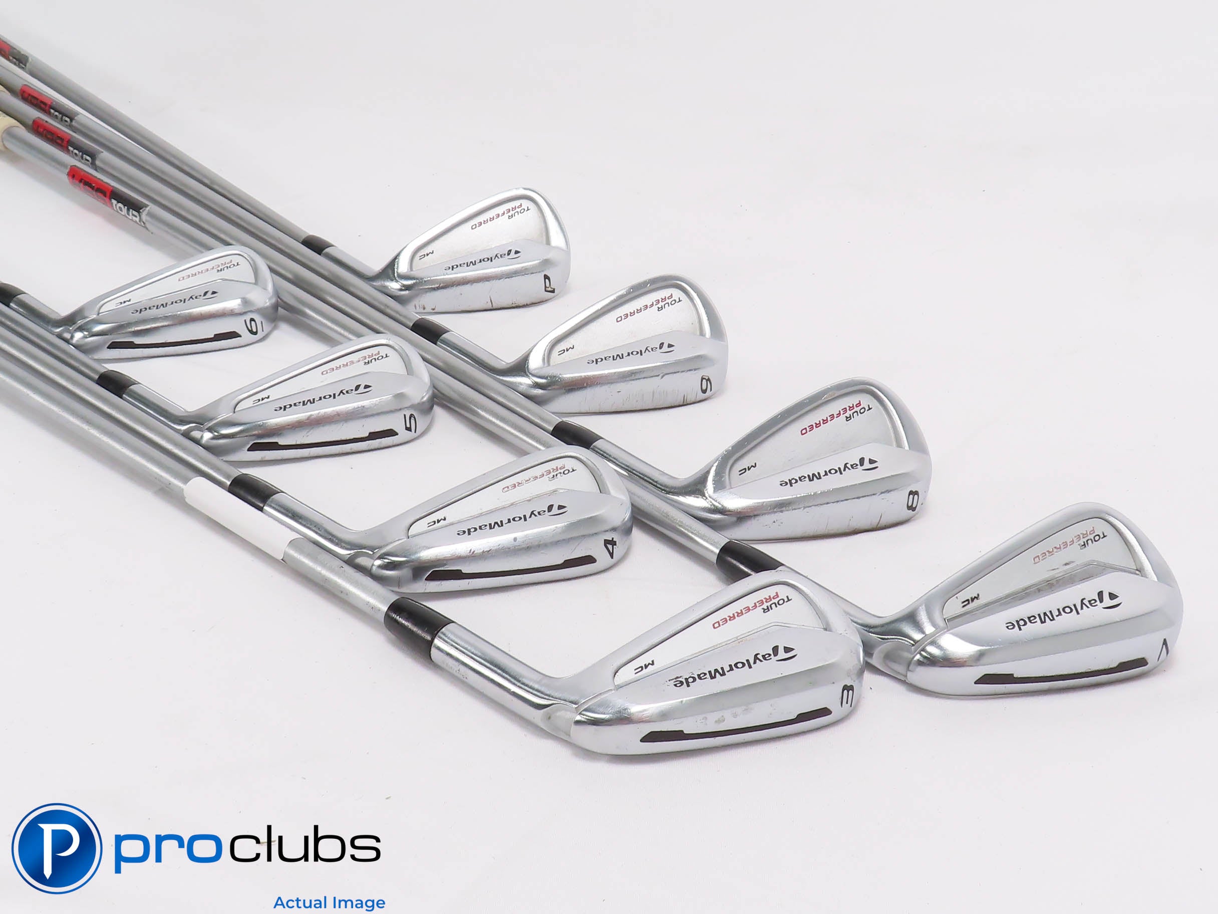 7.5 / 10 Average Condition. The faces and soles have some brush marks and some scarring from normal wear. The grooves show wear but still have some rounds yet to be played. The grips are worn and should be replaced. The 3 Iron has a Golf Pride Tour Velvet Midsize grip.