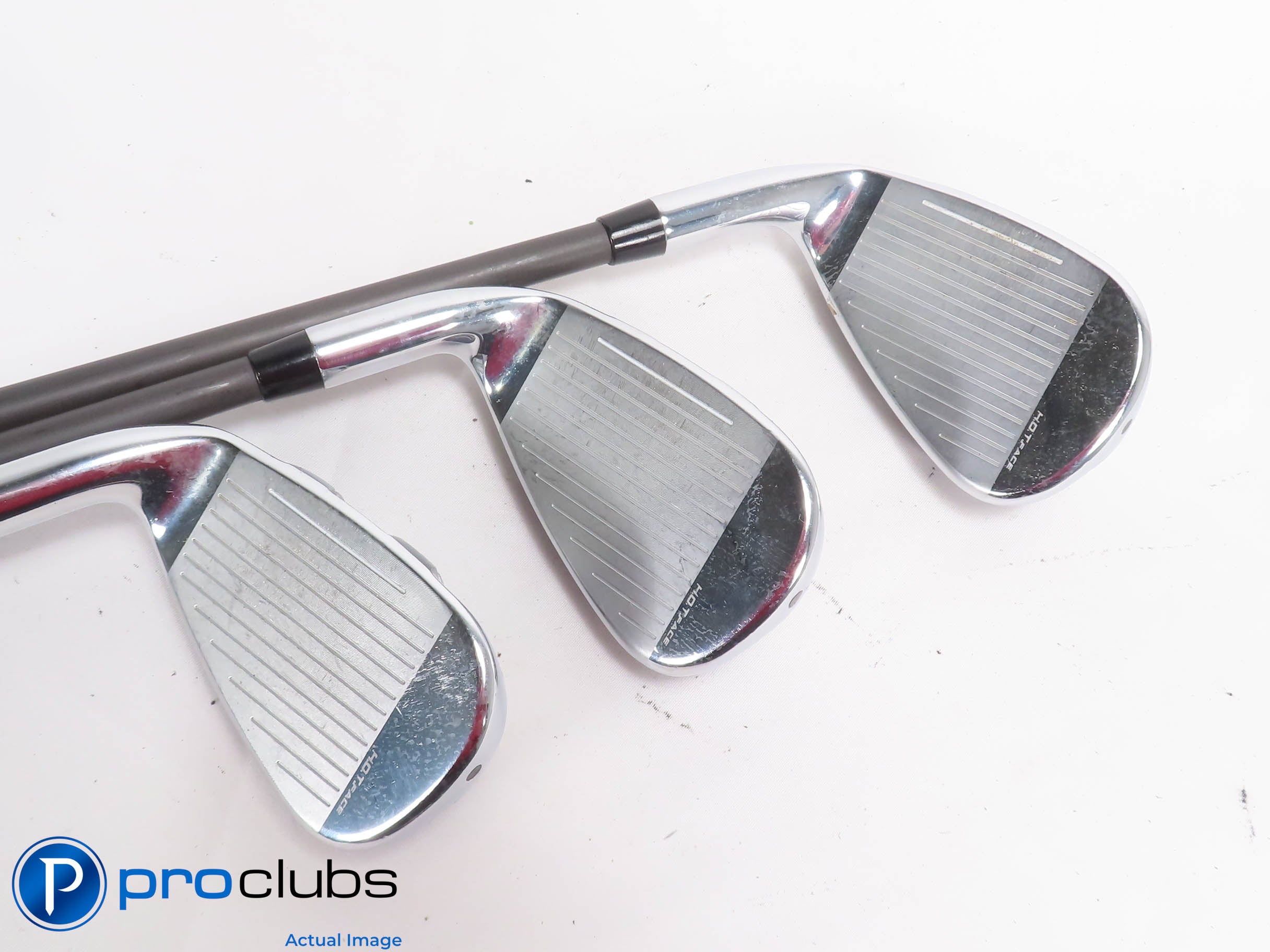 Condition Notes: 7.5 / 10 Average Condition. The faces and soles have some brush marks from normal wear. The grooves look good with lots of rounds yet to be played. The grips look and feel ok but show wear. The 4 Hybrid has some scratches and some nicks on the crown.