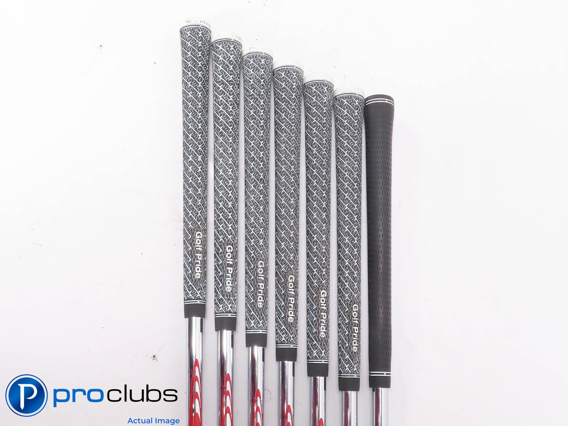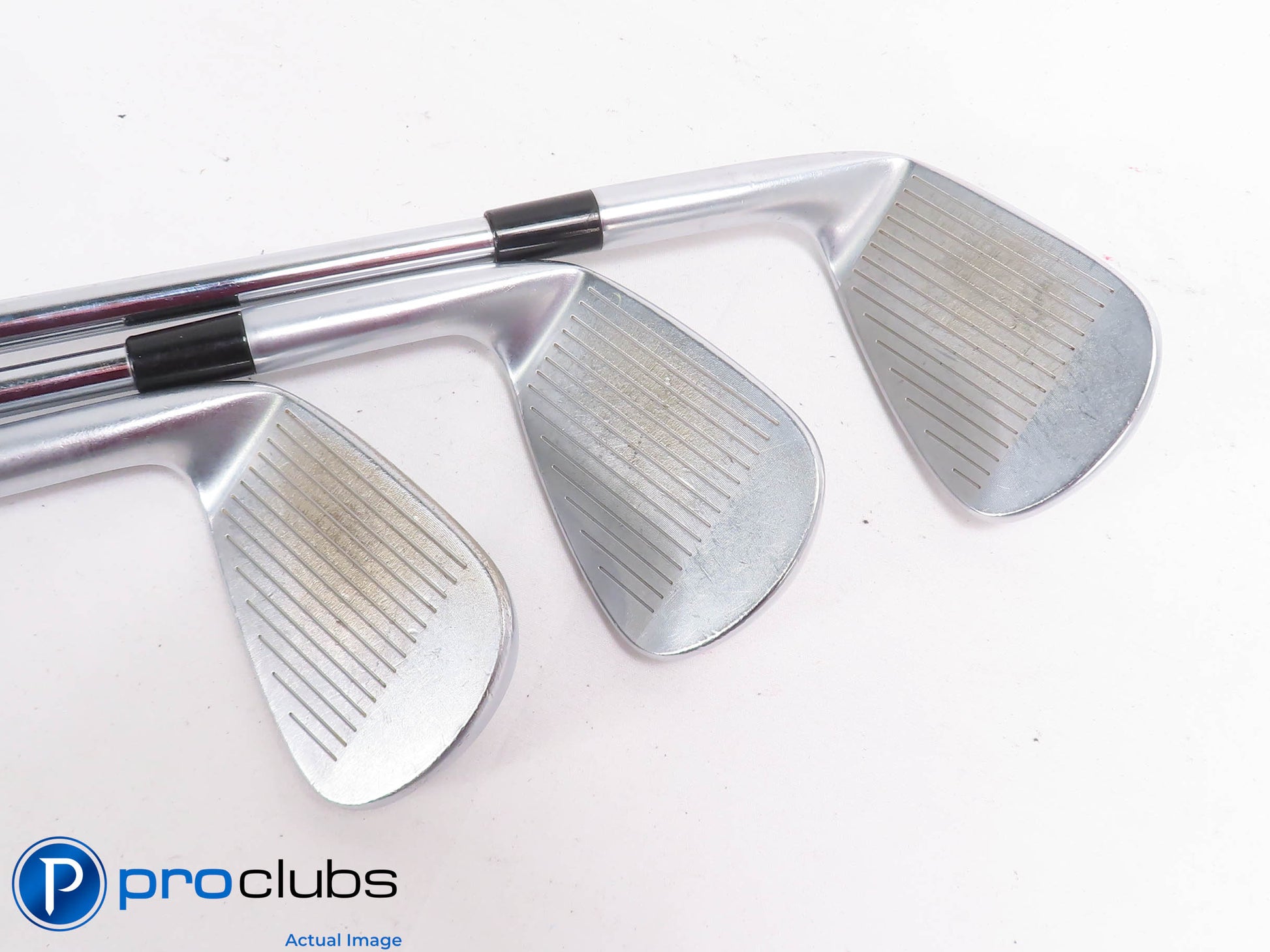 7.5 / 10 Average Condition. The faces and soles have some brush marks from normal wear. The grooves show some wear but still have plenty of rounds yet to be played. The grips are worn and should be replaced soon. The PW has a Golf Pride Tour Velvet grip.